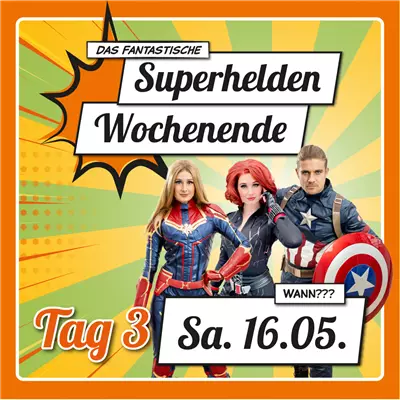 Erste Show: 11 - 11:30 Uhr am Superheldenquartier an der Mühle